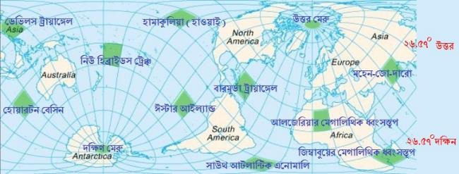 ২। একইভাবে ২৬.৫৭° সাউথ-এ রয়েছে সাহারা মরুভূমিতে জিম্বাবোয়ের মেগালিথিক ধ্বংসস্তূপ, সমুদ্রের এক গভীর অঞ্চল হোয়ারটন বেসিন, আরেক গভীর জায়গা নিউ হিব্রাইডস ট্রেঞ্চ, হেমবাবুর ইস্টার আইল্যান্ড এবং সাউথ আটলান্টিক এনোম্যালি— যেখানে ভ্যান এলেন বিকিরণ বলয় পৃথিবীর সব চেয়ে কাছে রয়েছে।