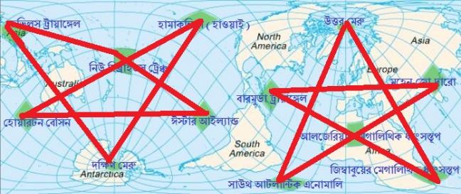 ৩। প্রশ্ন হল, এত জায়গার মধ্যে এই জায়গাগুলোই বা কেন বাছা হল? এই পাঁচটি করে জায়গাকে যদি আমরা ম্যাপে পরপর যোগ করি, তা হলে উত্তর ও দক্ষিণ গোলার্ধ এক সঙ্গে নিয়েই সেগুলি দুটি পাঁচ শীর্ষবিন্দু-যুক্ত তারার আকার ধারণ করে! হেমবাবু এই দুটি তারার কথাই বোধহয় বলেছিলেন। তা ছাড়াও দেখছি দুটি তারার ভেতরের দুটি বাহুর ছেদবিন্দুতে উত্তর ও দক্ষিণ মেরুও পড়ছে।