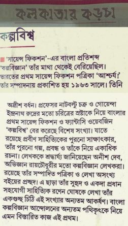‘সায়েন্স ফিকশন’-এর বাংলা প্রতিশব্দ ‘কল্পবিজ্ঞান’ তাঁর মাথা থেকেই বেরিয়েছিল। ভারতের প্রথম সায়েন্স ফিকশন পত্রিকা ‘আশ্চর্য!’ তাঁর সম্পাদনায় প্রকাশিত হয় ১৯৬৩ সালে। তিনি অদ্রীশ বর্ধন। প্রফেসর নাটবল্টু চক্র ও গোয়েন্দা ইন্দ্রনাথ রুদ্রের মতো চরিত্রের স্রষ্টাকে নিয়ে বাংলার প্রথম সায়েন্স ফিকশন ও ফ্যান্টাসি ওয়েবজিন ‘কল্পবিশ্ব’ বের করেছে বিশেষ সংখ্যা। যাতে রয়েছে প্রবীণ সাহিত্যিকের পুরনো সাক্ষাৎকার, তাঁর পুরনো গল্প, প্রবন্ধ ও তাঁকে নিয়ে একাধিক রচনা। লেখককে শ্রদ্ধার্ঘ্য জানিয়েছেন অনীশ দেব, অভিজ্ঞান রায়চৌধুরীর মতো কল্পবিজ্ঞান লেখকরা। রয়েছে তাঁর সম্পাদিত পত্রিকা ও লেখা অসংখ্য বইয়ের প্রচ্ছদ। এ ছাড়া তাঁর সুহৃদ ও একদা প্রধান সহযোগী সাহিত্যিক রণেন ঘোষকে লেখা তাঁর একগুচ্ছ চিঠি এই সংখ্যার অন্যতম আকর্ষণ। বাংলা কল্পবিজ্ঞান আন্দোলনের অন্যতম পথিকৃৎকে নিয়ে এমন বিস্তারিত কাজ এই প্রথম।
